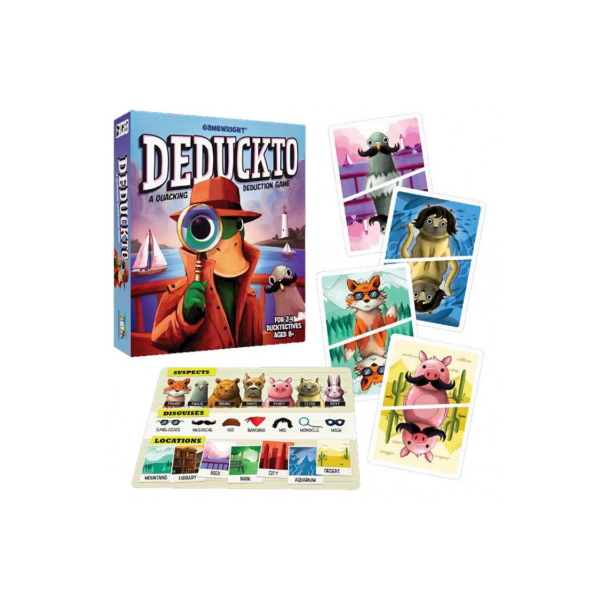 Put your sleuthing skills to the test in Deduckto to nab your secret suspect first. Use logic and deduction to correctly figure out the animal, disguise, and location on your hidden card. Do the clues point to Paulie the Pigeon wearing a Mustache in the Park? Or maybe it's Pinky the Pig in a Wig at the Pier! Be the first to suss out your suspect and you've quacked the case!