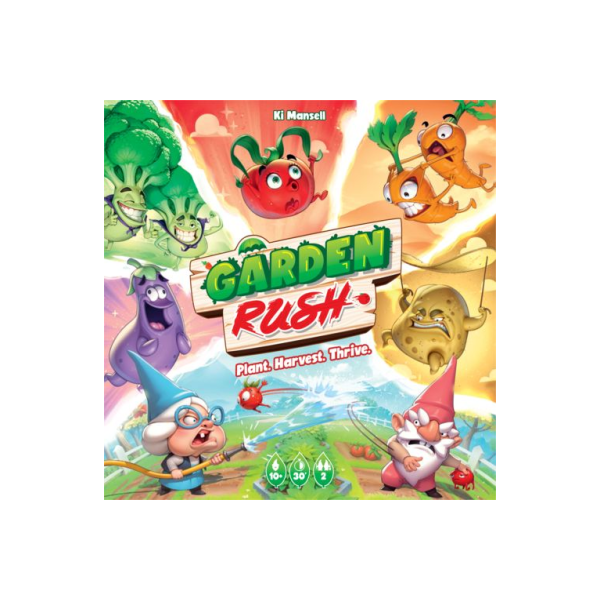 Garden Rush is a two-player, tile-placement battle game in a vegetable garden in which players race to grow vegetables in their garden and fill their basket before their neighbor. Careful planning is needed to plant each vegetable in its unique pattern for future harvesting, while keeping an eye on the conveyor belt shared between the gardens.
