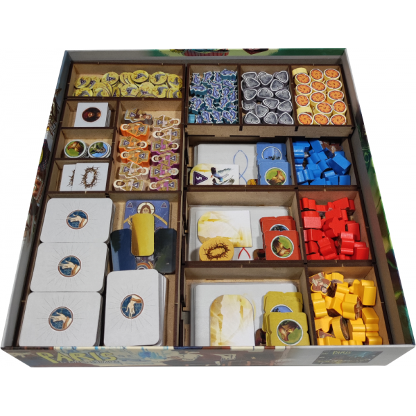Wooden insert compatible with IERUSALEM. Holds sleeved cards. Individual trays, so you can use them to have easy access to cards and components during the game while keeping everything organized.
