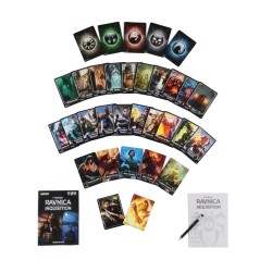 The fate of Ravnica hangs in the balance! Join the Gatewatch or pledge your loyalty to Nicol Bolas in Ravnica: Inquisition, a social deduction game set on the Magic: The Gathering plane of Ravnica. Each player takes on the role of a representative of a Ravnican Guild that is either loyal to the Gatewatch or an Agent of Bolas. The Gatewatch loyalists are tasked with discovering who the Agents of Bolas are, while the Agents of Bolas simply need to survive in order to further the schemes of Nicol Bolas.