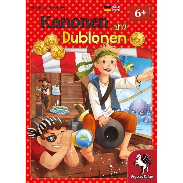 In Cannons & Doubloons players each turn secretly choose one of their pirate cards simultaneously, to decide which of the three treasure islands they will visit. If they are the only one at the island, they may collect all doubloons they find there. If other players decided to visit the same island, each players must roll a die that determines if they stay in combat over the treasure, or if they retreat – only if a single player is left in combat, this player receives all doubloons. In the end, the richest pirate wins.