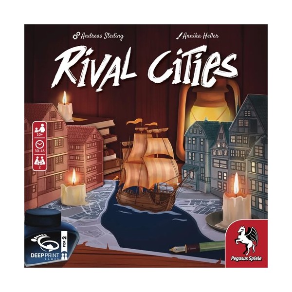 In the 16th century, the small fishing village of Altona was founded in Northern Germany, initially posing no threat to its long-established neighbor, Hamburg. However, as Altona rapidly grew, a fierce rivalry emerged between the two cities, each constantly trying to outdo the other. In Rival Cities, you face off in an enthralling city duel. Outmaneuver your opponent to achieve an instant victory - but beware as either of you can pull this off in many ways. Only by combining foresight with the art of deflection will you lead your city to victory. The suspenseful back and forth between the players makes it a very confrontational gaming experience full of weighty decisions.